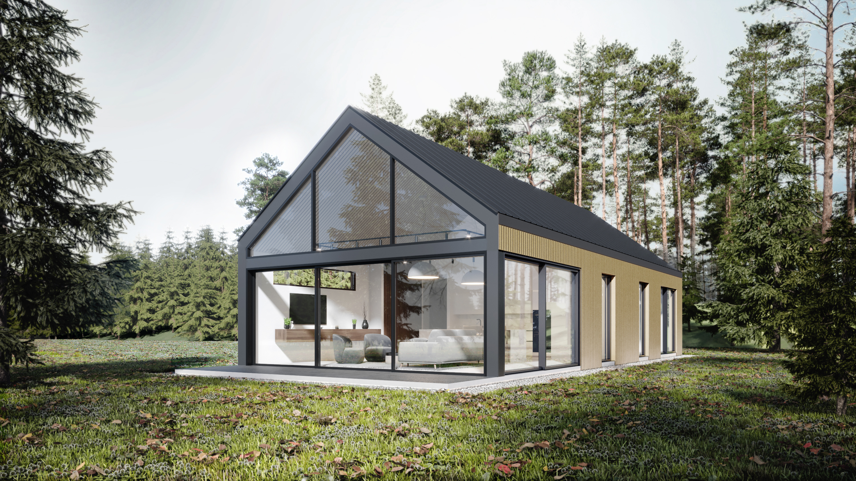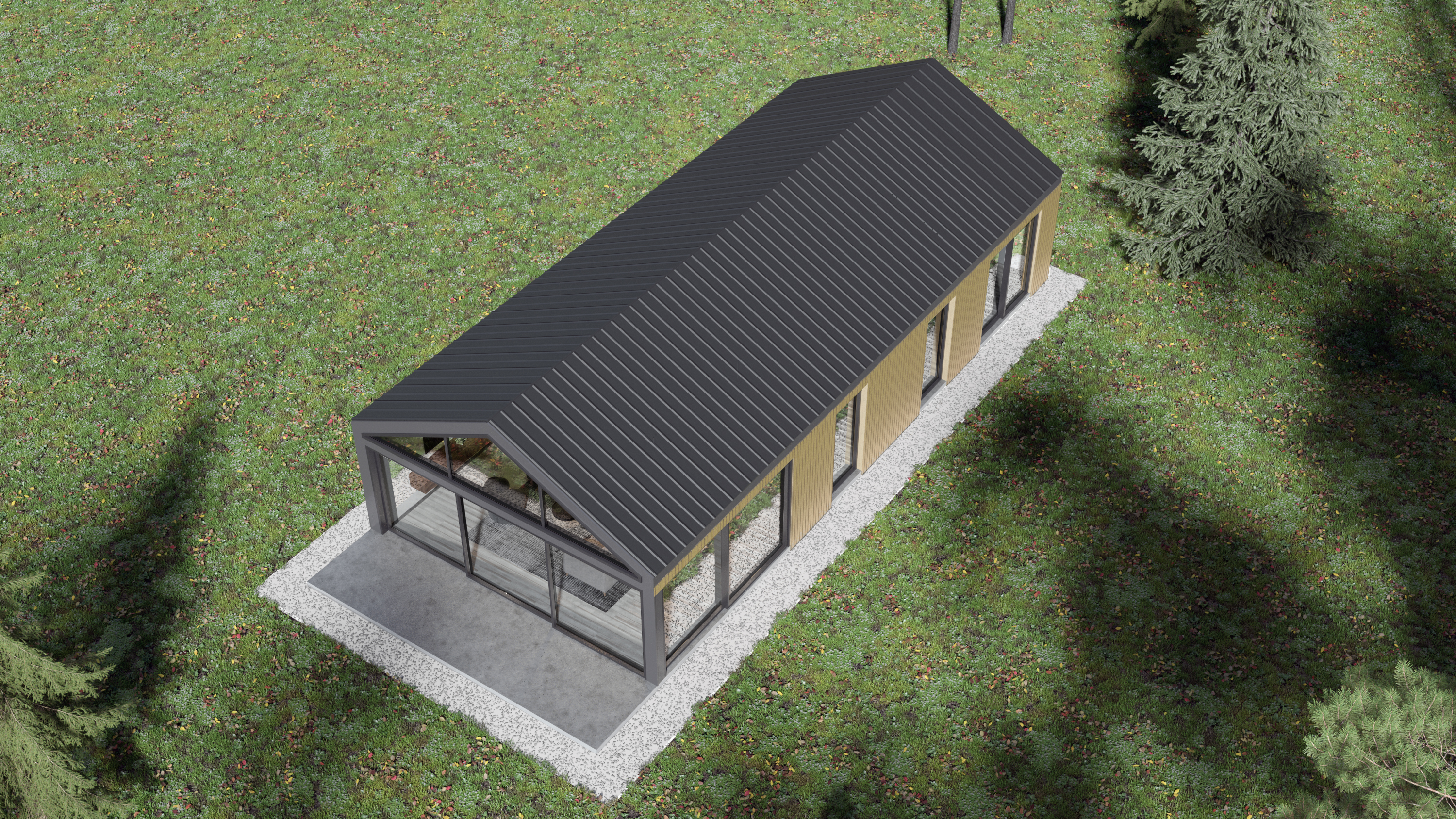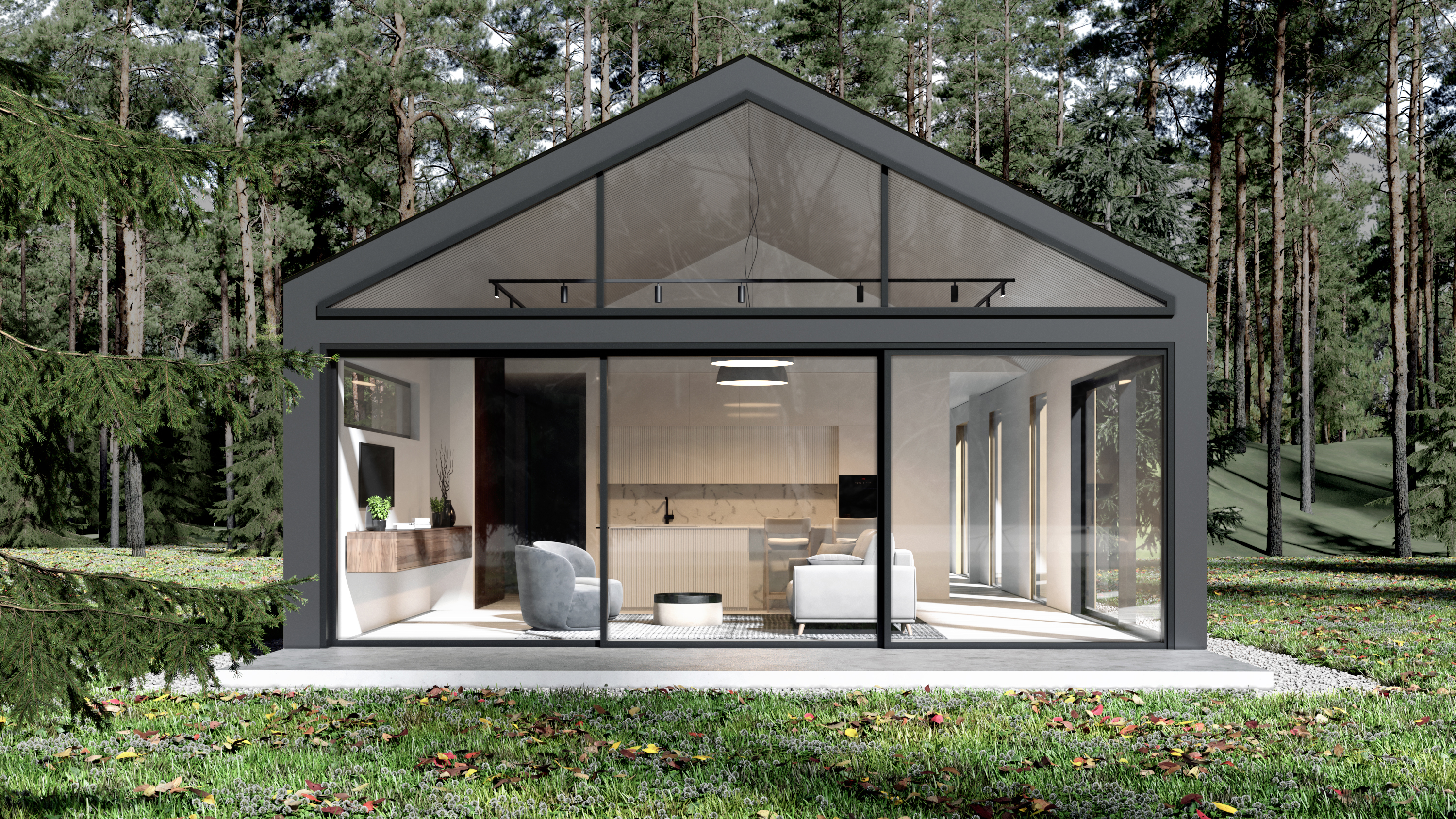 The Mystiq model embodies modern chalet design with its dramatic window wall and single-story layout. Featuring a private loft and expansive wrap-around deck, this cabin offers both intimacy and grandeur with contemporary mountain style.
